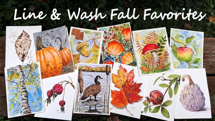 Capture the beauty of Autumn with 12 pen and ink with watercolor paintings, you can complete with limited supplies.